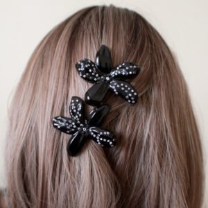 This set of Lamia hair clips features two sculptural black floral barrettes, each hand-embellished with glimmering rhinestones. Inspired by high jewelry and statement style, these handmade pieces bring dramatic elegance to your look — whether worn together or styled separately.