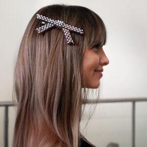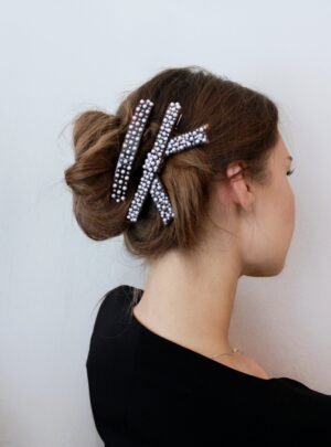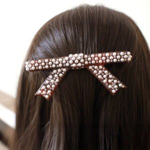 Madam clip dazzles with a rich tortoise finish, adorned with shimmering rhinestones and delicate pearls in a refined bow shape. The ultimate finishing touch for elegant updos or statement side-swept looks.